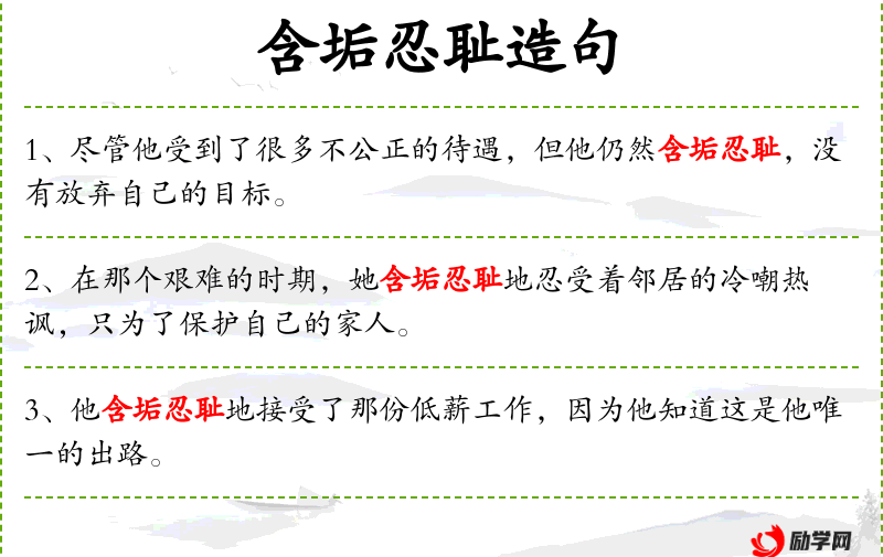 - 含垢忍耻:形容忍受屈辱和羞耻。
