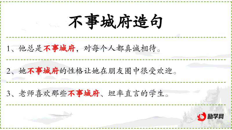 1. 【不事城府】 城府:城市和官署,指难以揣度的心机。比喻胸怀坦荡,无所隐藏。