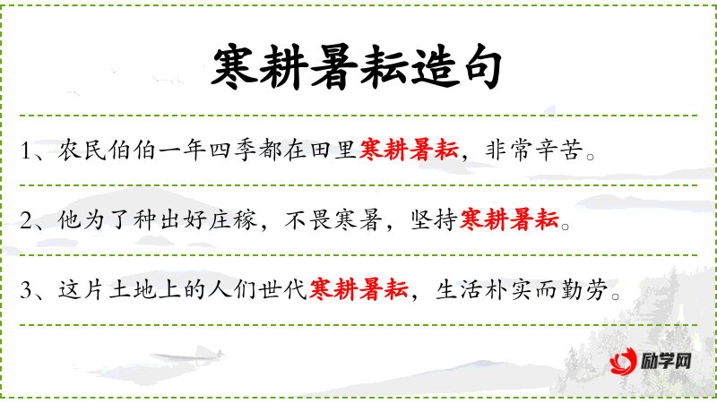 - 英文:He braves the cold and heat, persisting in farming during winter and weeding during summer, all for the sake of growing good crops.