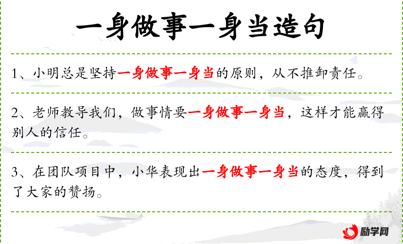 1. 【一身做事一身当】 当:承担。自己干的事情由自己一个人承担。