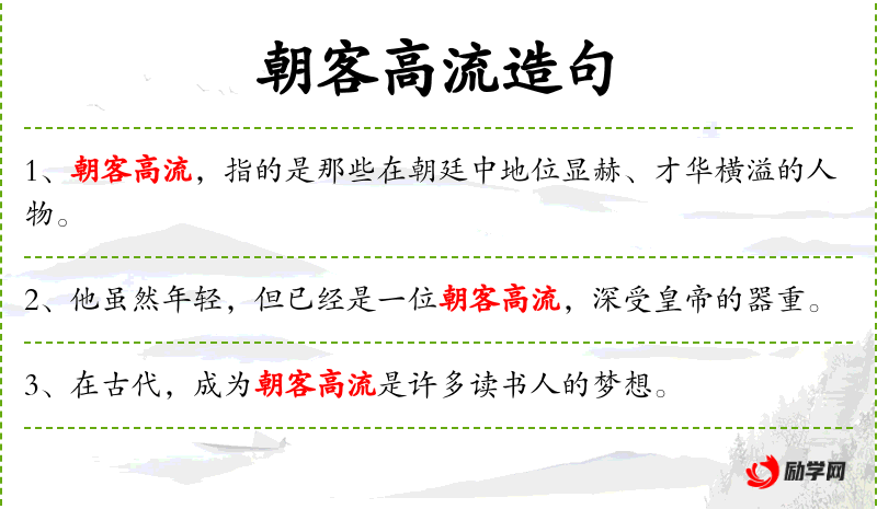 3. 【朝客高流】 - 朝:朝廷;流:品级。旧指职位高而声执势显赫的人物。