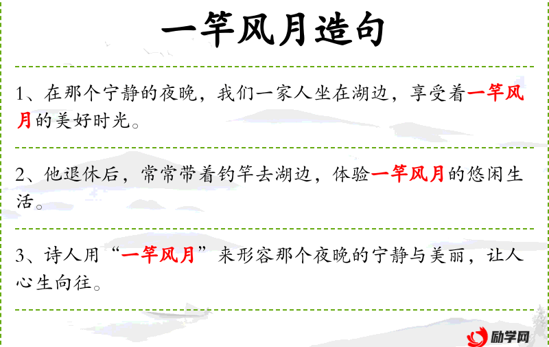2. 【一竿风月】 风月:清风明月,指美好的景色。比喻忘却世事,在清风明月的美景下行乐。