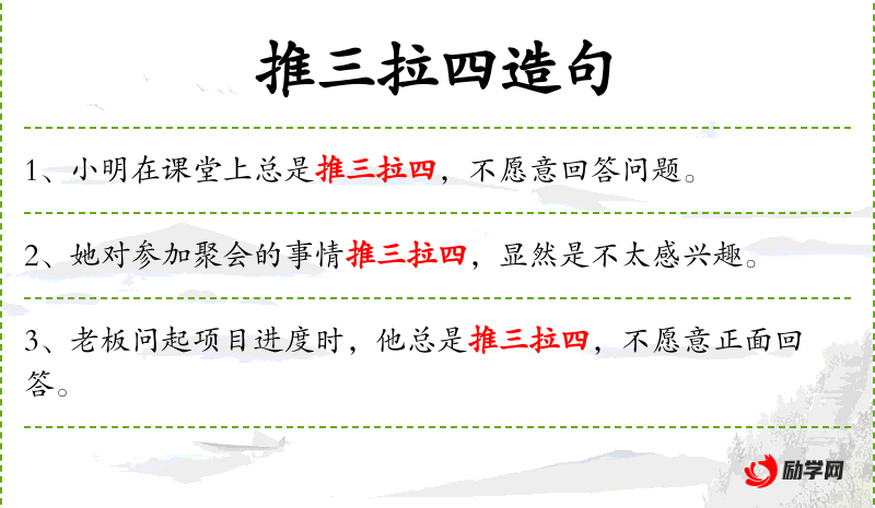 1. 【推三拉四】 推:推诿。找各种借口推托、阻挠。