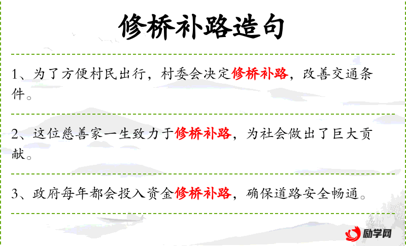 - 修桥补路:指的是对桥梁和道路进行维修和建设,通常用于改善交通状况和基础设施。