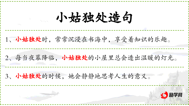 1. 【小姑独处】 指少女还没有出嫁。
