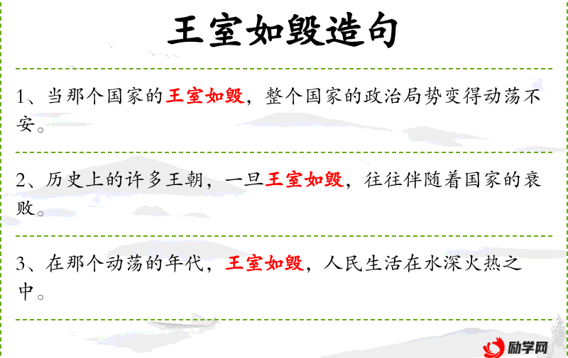 王室:指周王朝;毁:焚烧。原指西周王朝遭犬戎之难,如火烧毁。后泛指封建王朝濒于灭亡。