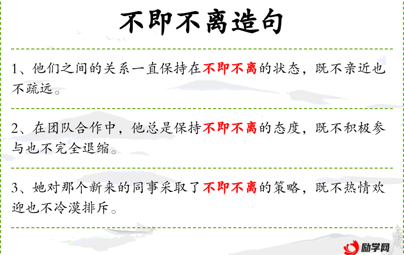 成语“不即不离”源自传统文化,常用于描述人际关系或处理事务时的中庸之道。这种态度在文化中有时被视为一种智慧,特别是在处理复杂或敏感的问题时。