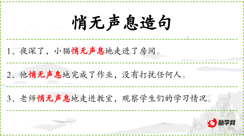 - 悄无声息地:静悄悄地、无声无息地