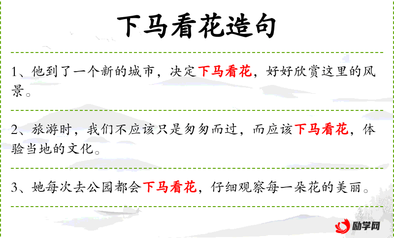 1. 【下马看花】 - 比喻停下来,深入实际,认真调查研究。