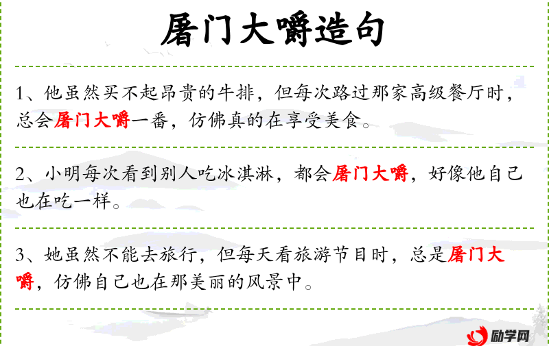 - 状语:虽然不擅长画画,但每次看到美术展览时,总是屠门大嚼地