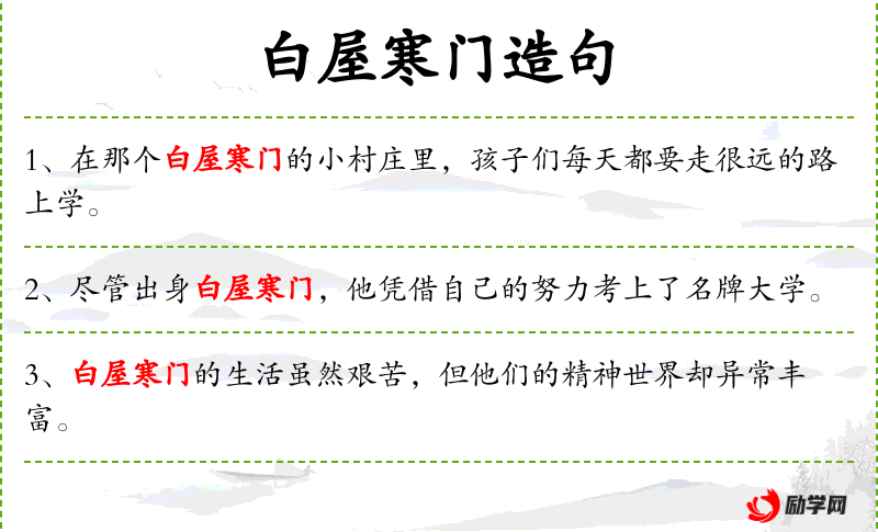 5. 【白屋寒门】 白屋:用白茅草盖的屋;寒门:清贫人家。泛指贫士的住屋。形容出身贫寒。