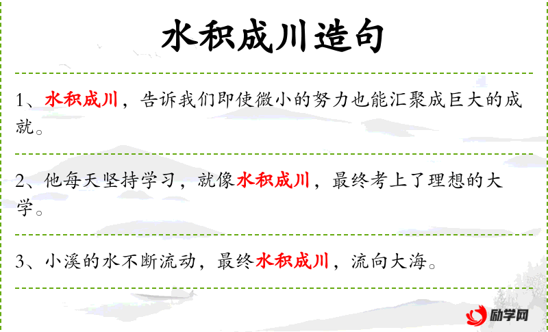 4. 【水积成川】 川:河流。指水积多了才能成为河流。比喻在学习上日积月累,必然能成才。