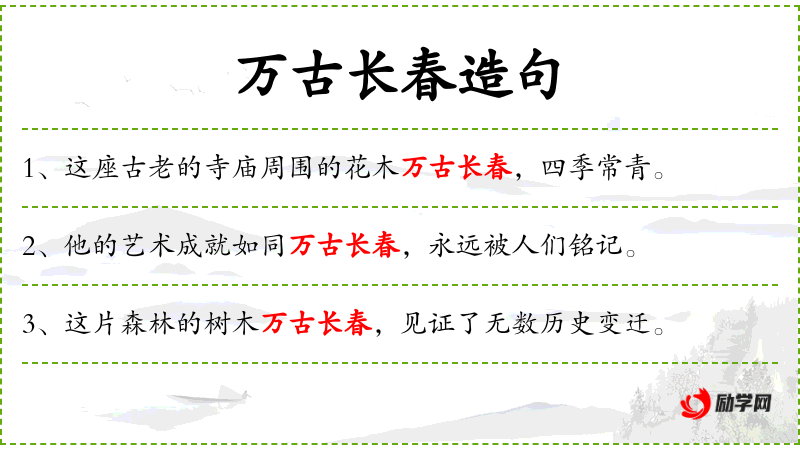 1. 【万古长春】 - 万古:千年万代,永远。永远像春天一样,草木翠绿,生机勃勃。比喻人的精神永远像春天一样毫不衰退或祝愿好事长存。亦作“万古长青”、“万古常青”、“万古常新