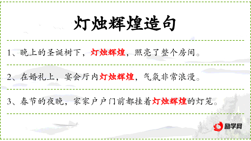 1. 【灯烛辉煌】 - 辉煌:光辉耀眼。形容灯光烛火通明,光辉耀眼。
