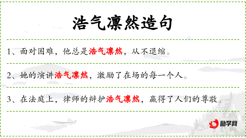 2. 【浩气凛然】 - 浩气:即正气,刚直正大的精神;凛然:严肃,令人敬畏的样子。浩然之气令人敬畏。