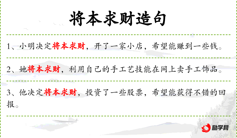 - 将本求财:成语,意思是利用自己的资本或资源来赚钱。