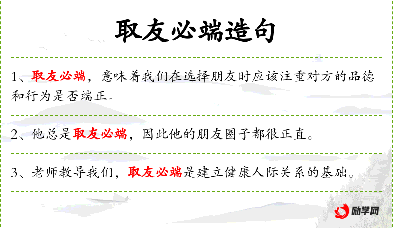 1. 【取友必端】 取:选取;端:端正。正派的人选择朋友必然端正。形容选择朋友必须是品行端正的人。