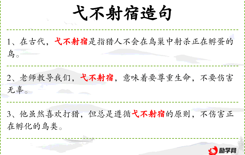 1. 【弋不射宿】 弋:射鸟器;宿:歇宿了的鸟。射箭者不射杀已归巢的鸟。比喻贤者隐逸不仕以远避暴乱之害。