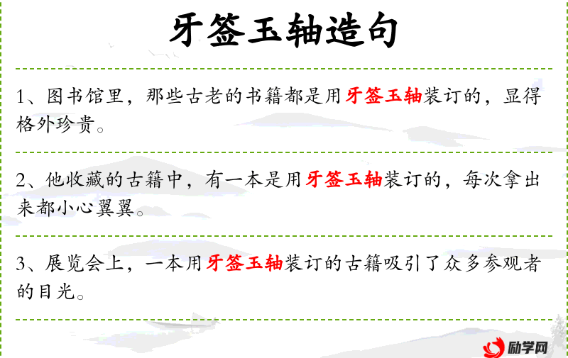 3. 【牙签玉轴】 - 卷型古书的标签和卷轴。借指书籍。牙,象牙;玉,美玉。形容书籍之精美。