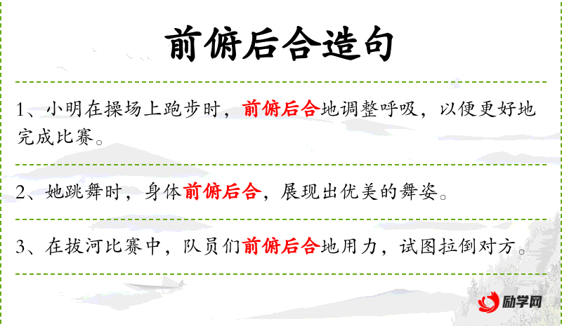 句子:“孩子们在玩跳绳时,前俯后合地跳跃,玩得不亦乐乎。”