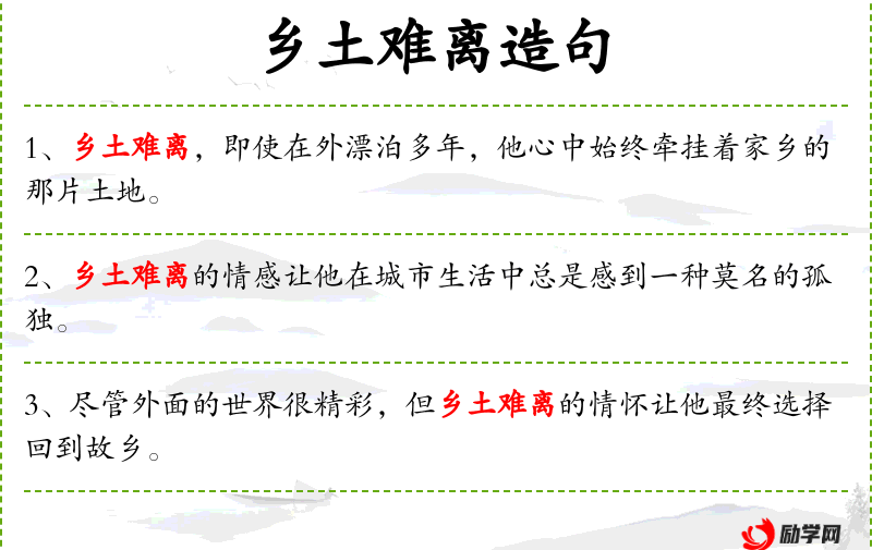 1. 【乡土难离】 乡土:家乡,故土。难于离开故乡的土地。形容对家乡或祖国有无限的眷恋之情。