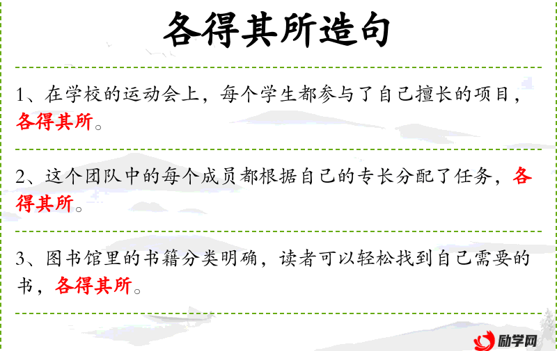 - 可以用不同的句式表达相同的意思,例如:“在图书馆,书籍被明确分类,使得每位读者都能轻易找到他们所需的书籍,从而各得其所。”