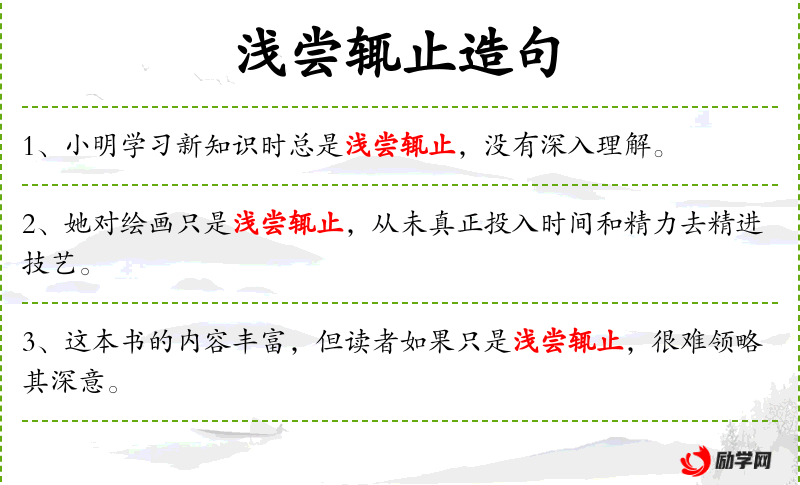 5. 【浅尝辄止】 - 辄:就。略微尝试一下就停下来。指不深入钻研。