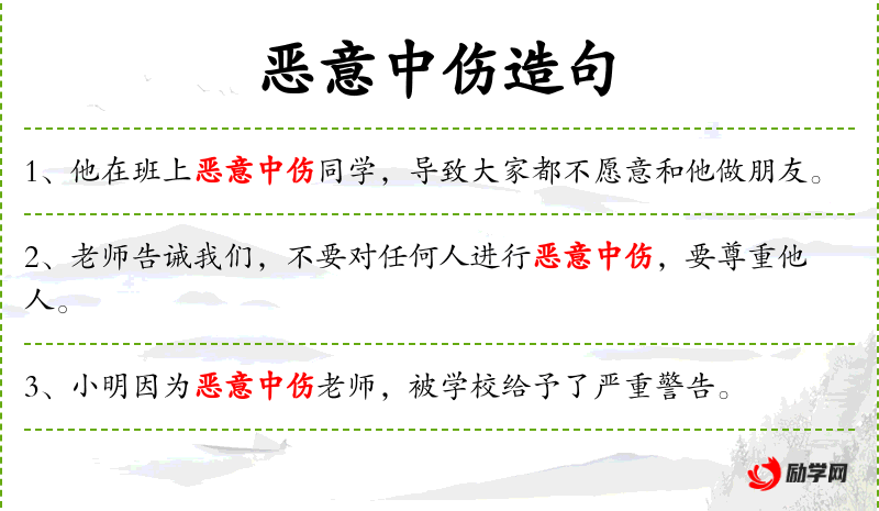 句子:“同学们应该团结友爱,避免任何形式的恶意中伤。”