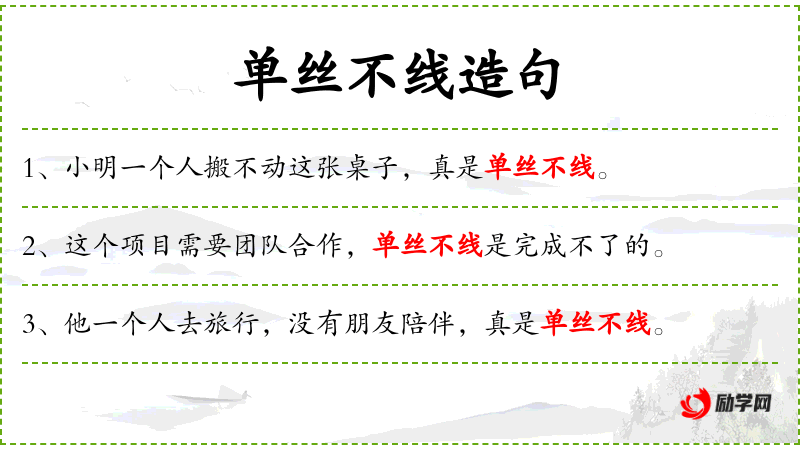 1. 【单丝不线】 一根丝绞不成线。比喻个人力量单薄,难把事情办成。