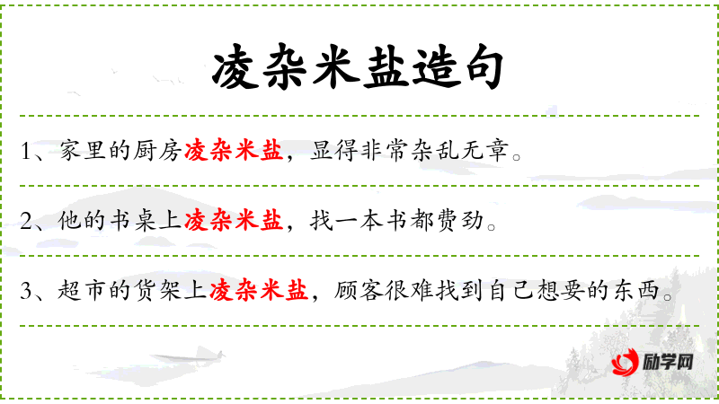句子:“[教室的角落凌杂米盐,需要学生们一起帮忙整理。]”