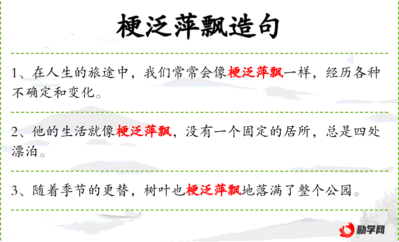 5. 【梗泛萍飘】 - 断梗、浮萍在水中漂浮。比喻漂泊流离。