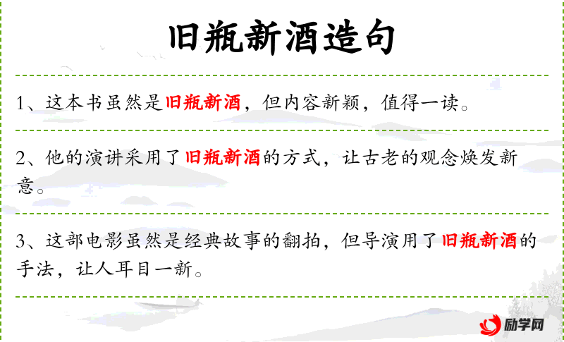6. 【旧瓶新酒】 比喻旧形式,新内容的意思。