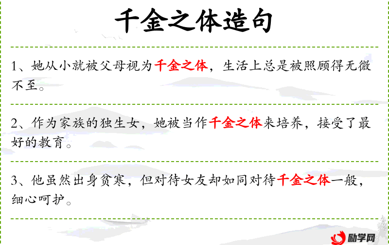 句子中的“千金之体”是一个成语,源自**传统文化,用来形容出身富贵家庭的女子。这个成语体现了对高贵出身的一种传统观念,同时也反映了社会对个人修养和气质的重视。