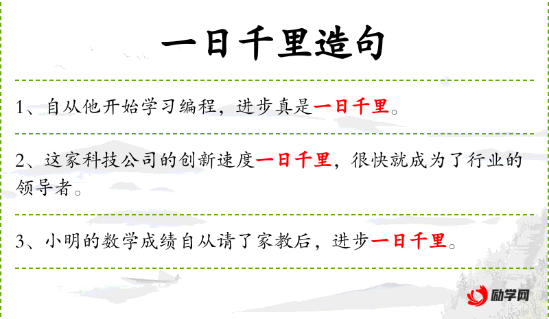 1. 【一日千里】 - 原形容马跑得很快。后比喻进展极快。