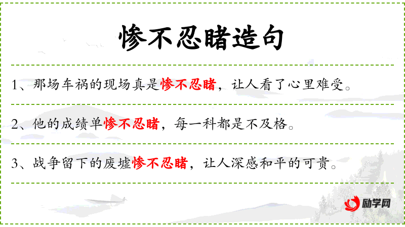 - 惨不忍睹:形容景象非常悲惨,让人不忍心看。