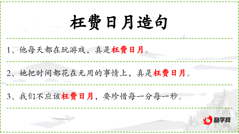 5. 【枉费日月】 枉:白白地。费:浪费。日、月:时间、光阴。白白地浪费时光。