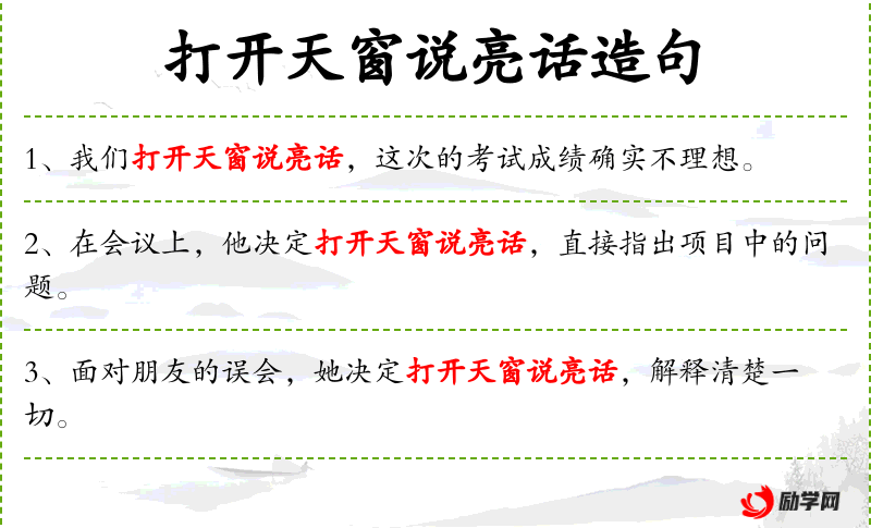 - 打开天窗说亮话:成语,意为坦率直言,不隐瞒。