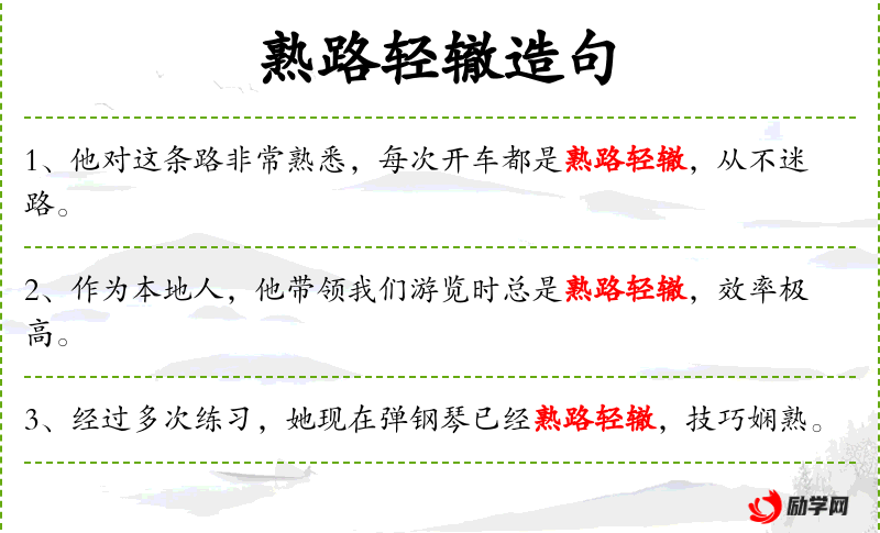 5. 【熟路轻辙】 - 驾轻快的车,走熟悉的路。比喻处世有经验,办起事来很容易。
