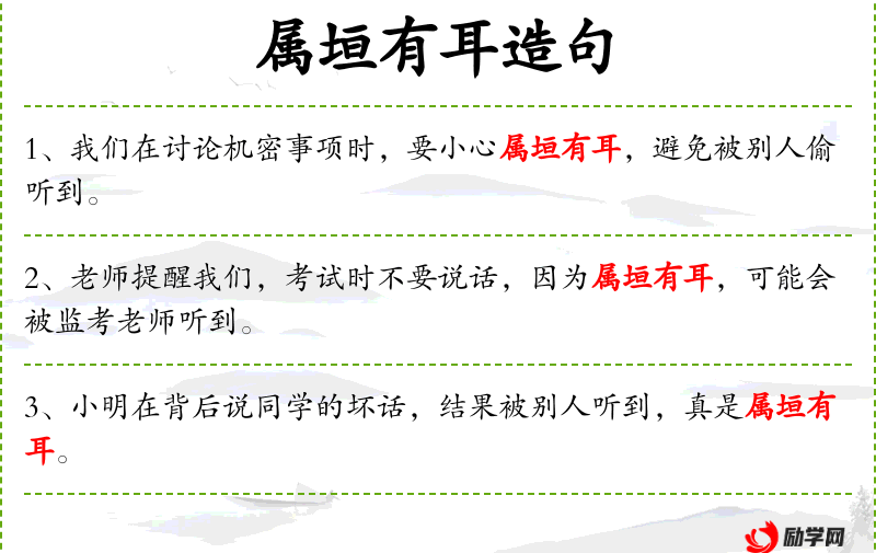 - 相关成语:“隔墙有耳”与“属垣有耳”意思相近,都提醒人们要小心说话,防止秘密泄露。