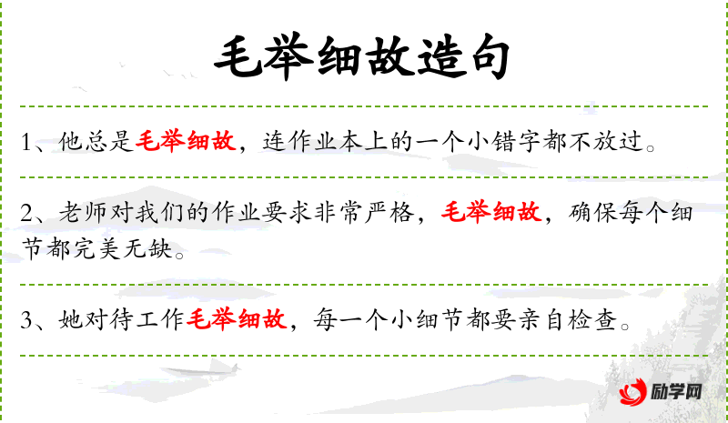 3. 【毛举细故】 - 毛:琐碎;细故:小事。指烦琐地列举小事情,加以责难或攻击。