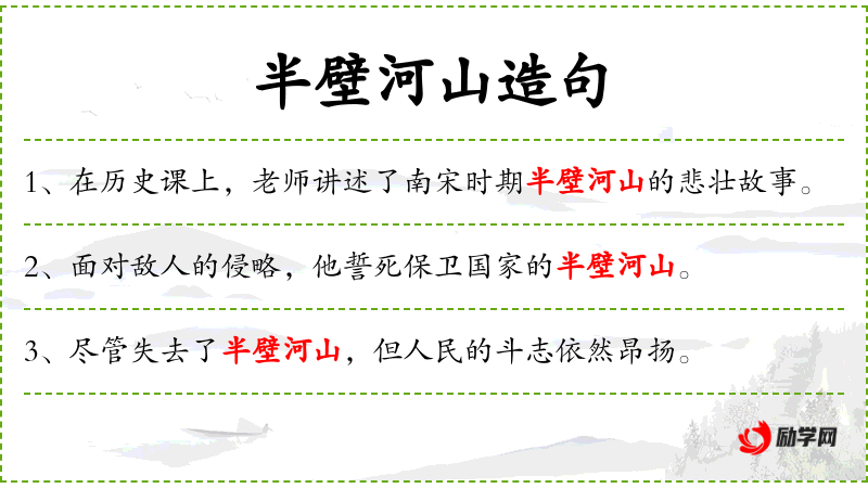 - 半壁河山:比喻国家或地区的一部分,常用来形容国土的丧失或分裂。