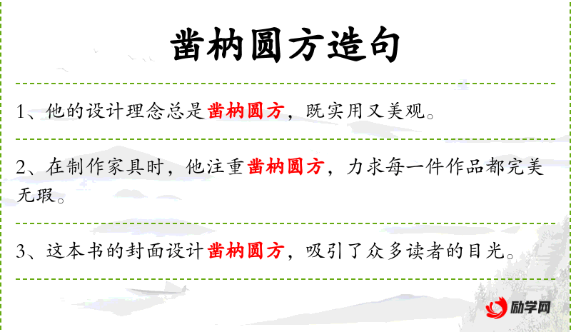 - 凿枘圆方:这个成语源自**传统文化,体现了中庸之道,即在传统与现代之间找到平衡。