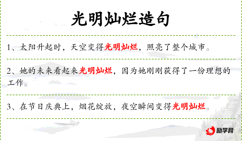 1. 【光明灿烂】 灿烂:光彩明亮的样子。形容光明耀眼,色彩艳丽。比喻事业的伟大辉煌。