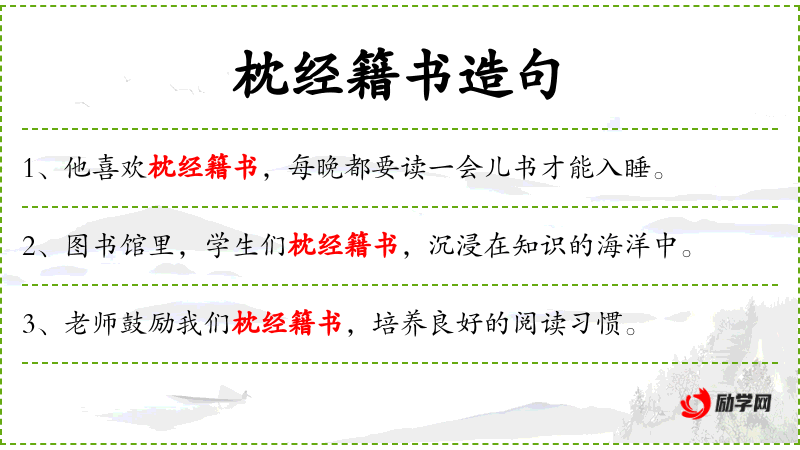 3. 【枕经籍书】 - 枕着经,垫着书。形容酷嗜读书,以书为伴。