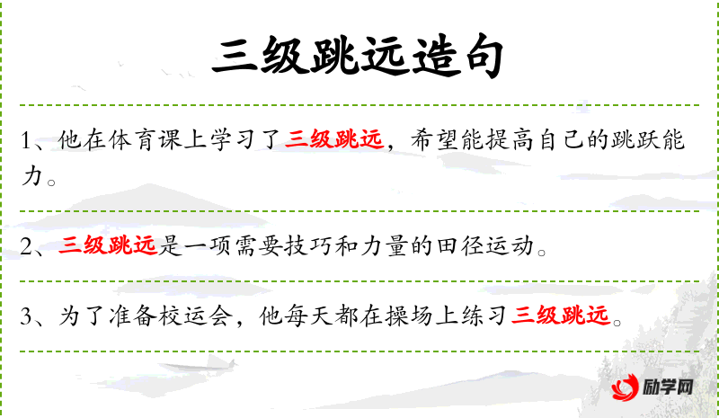 1. 【三级跳远】 - 田径运动项目之一,运动员经过快速助跑后连续跳三步,第一步用起跳的脚落地,第二步用另一只脚落地,第三步两脚落地。