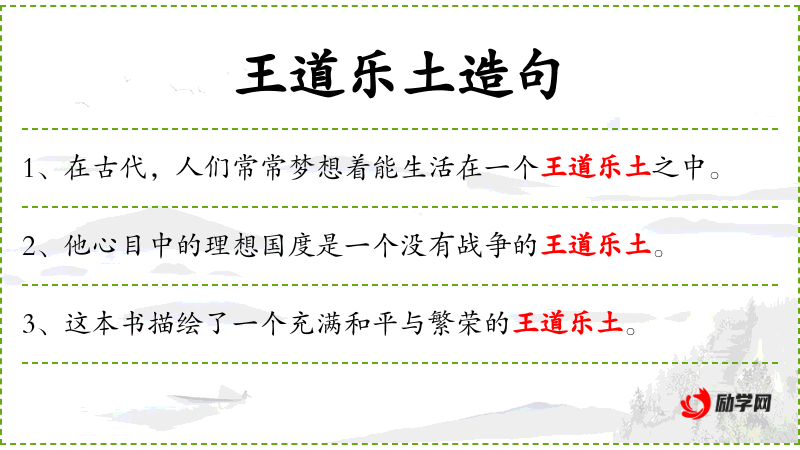 王道:统治者治理国家应遵循的道理;乐土:安乐的土地。指施行仁政,把国家治理得很好,百姓安居乐业。