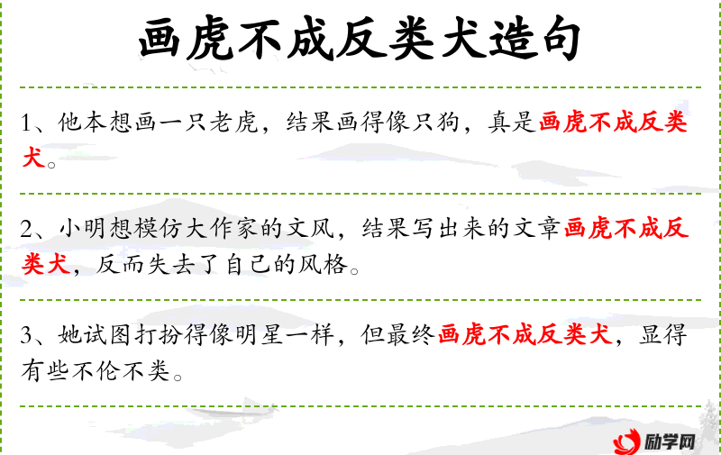 5. 【画虎不成反类犬】 比喻模仿不到家,反而不伦不类。同“画虎不成反类狗”。