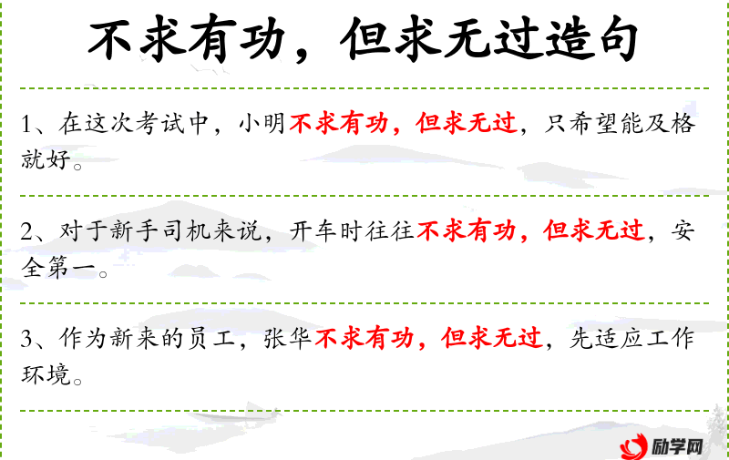 1. 【但求无过】 - 但:仅,只要;过:错误。只追求没有过错。形容做事保守平庸怕出差错。