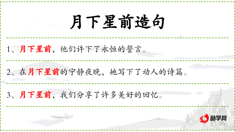 2. 【月下星前】 - 指清爽幽静的环境。借指谈情说爱的地方。