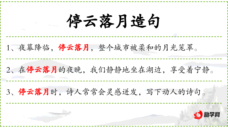 - 停云落月:形容云彩静止、月亮落下,常用来描绘宁静、悠远的夜晚景象。